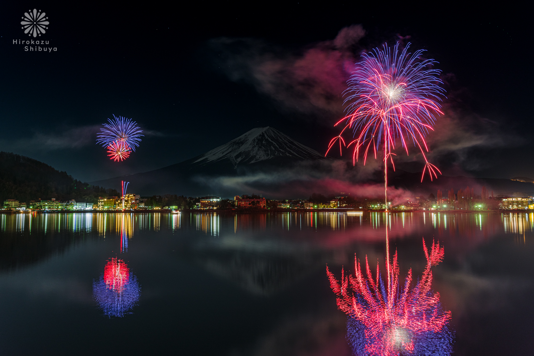 とりあえずのところ、北寄りの風が吹いている満月がよく見える夜に河口湖の北岸へ赴けば高い確率で冠雪した富士山と花火のコラボレーションが楽しめると思っていただければよろしいかと思います。(雑w